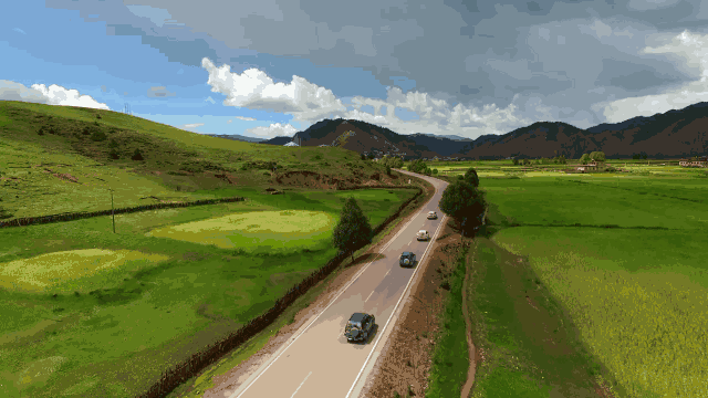 小桥、流水、人家,花团锦簇、青稞油绿,没有一片土地多余。朴素的乡村小路,野生桃树伫立路边,粉红挂满枝头,隔路拥抱一起,只留下一个奇幻的门洞。