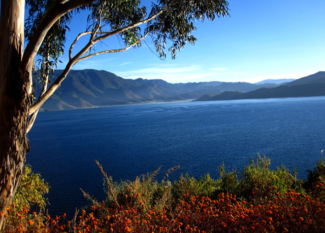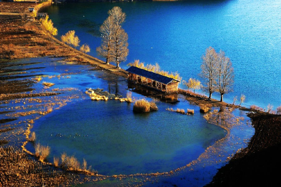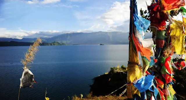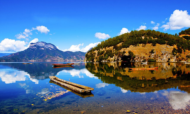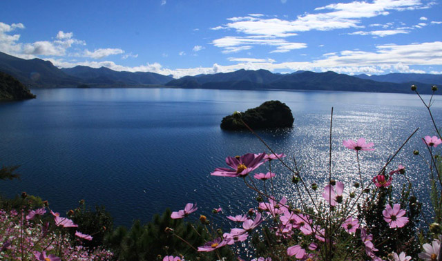 从高处鸟瞰,如一只展翅的飞燕也是四川的第一大天然淡水湖,被誉为“高原明珠”。湖的西北面,雄伟壮丽的格姆山巍然矗立,这即是摩梭人人为之崇拜而人格化的格姆女神。湖的东南南,与草海连接,这里牧草丰盛,牛羊肥美,浅海处茂密的芦苇随风荡漾,蔟蔟的花草迎风招展,每到冬季,天鹅、黑颈鹤等珍稀候鸟数以万计栖息于此,平添一种生气,一种景致。