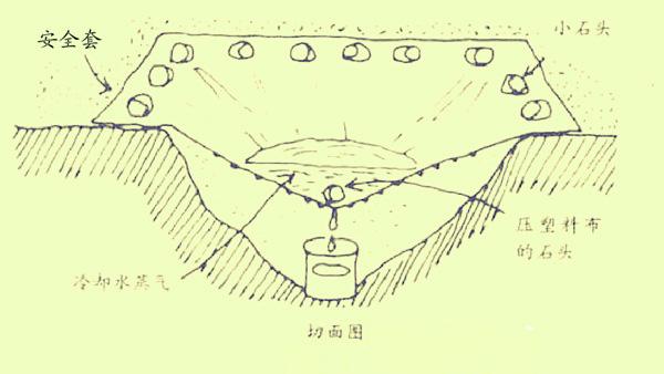 专门介绍以免与上一功能混淆。在沙漠、原野或丛林中,没有丰富水源时可用此法。夜晚前在地上挖一小坑,坑中央放一容器。将安全套展平扪在坑口上,有土将四周压好,安全套上放一小石头,使其呈倒尖锥状。夜间冷空气使坑内升起的水汽在安全套上凝结成水珠,并聚集滴下,进入容器中。为增加水汽,还可在坑内多放些树叶和青草。理论上讲,你在清晨可收获半升到一升蒸馏水哟!