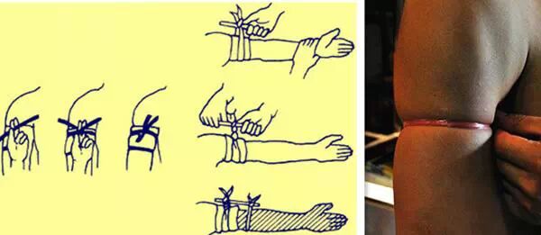 户外旅游有可能遇到各种艰险,如果突发损伤出血了,那就参照在医院抽血时医生用止血带操作方法。