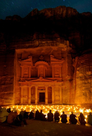 45、佩特拉petra。从约旦首都安曼往南,3个多小时的行程,两边尽是茫茫大漠。当视线正因为厌倦了枯燥的沙地和沙丘而昏昏欲睡时,前方忽然冒出一片黝黑冷峻的山脉,形状象一团团冲天沸腾的泉水,山顶还有云彩缭绕,这时的惊喜恐怕是很难言传的。而佩特拉,传说中的阿里巴巴进入的宝库,就躲在这群山之中。