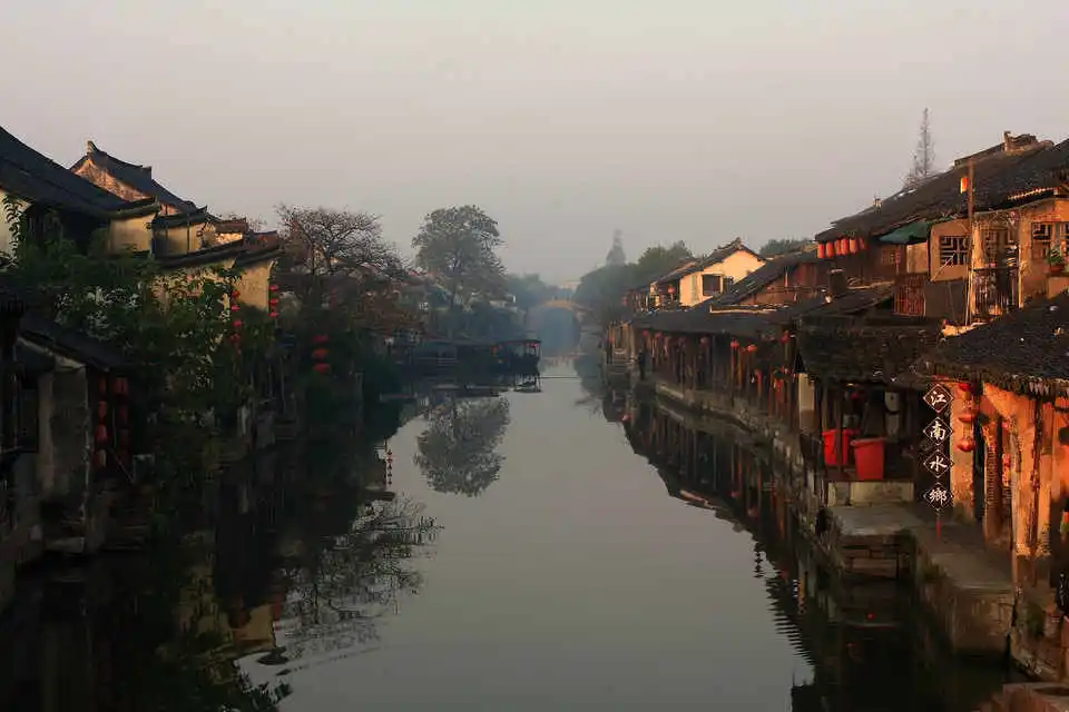 远眺水乡,白墙墨顶,舟影波光,在薄雾的晕染下恰如一幅淡彩的宣纸画;走进古镇,廊棚苍老,弄堂幽深,似乎进入了久远的历史。
