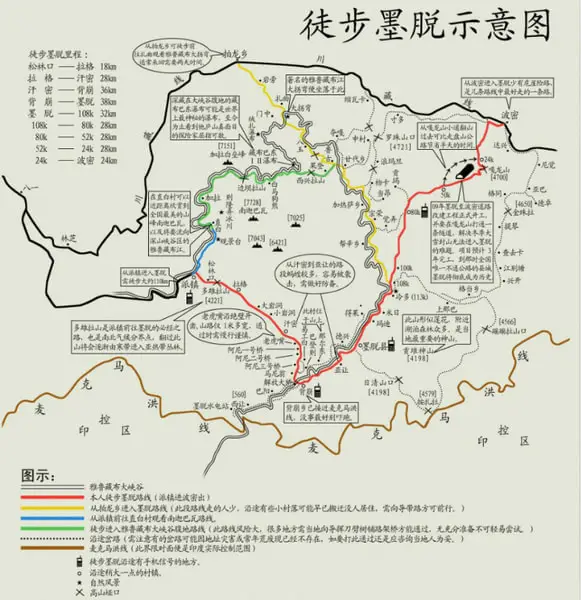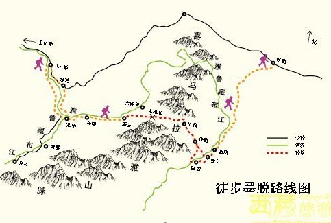 从派乡翻越海拔4000多米的多雄拉山口,沿多雄拉到拉格,汗密,背崩后,逆雅鲁藏布江北上至墨脱县城,全程约115公里,步行需4天时间,走墨脱是徒步爱好者的终极梦想,这里是高原上海拔最低,生态环境保存最完整,气候最温和,雨量最充沛的地方,这里也是塌方,泥石流,蚂蟥,野兽,毒虫,暴雨,烈日,高山,峡谷,雨林完美结合的中国最顶级户外徒步路线。
