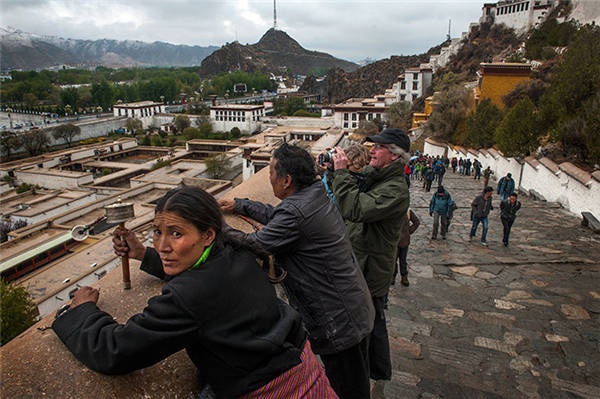布达拉宫的一角,阳光灿烂,树影婆娑队伍从海拔2900米的林芝地区一路西行,原生壮丽的巴松措,湍急蜿蜒的尼洋河,穿越经幡摇曳于天穹、海拔5013米的米拉山口,最终来到圣洁的拉萨。布达拉宫向我们一行人打开大门,让我们有幸一睹其内部不为人熟知的种种。雄伟的布达拉宫脚下布达拉宫坐落于海拔3700米的红山上,表述着藏族人民超凡的智慧和厚重的历史。公元7世纪,著名的吐蕃第三十三代赞普松赞干布在迁都拉萨后创建了布达拉宫。公元1645年,五世达赖喇嘛决定重建布达拉宫,经过多年不断建造堆积,直到1933年十三世达赖喇嘛圆寂后,才最终成就了今日我们所看到的布达拉宫。八世达赖喇嘛灵塔殿大门位于红宫中央,五世达赖喇嘛灵塔殿外的享堂“西有寂圆满大殿”值得一提的,便是我们有幸参观了平日里不对游客开放的十三世达赖喇嘛灵塔殿。灵塔殿位于红宫与扎夏之间,走过一条幽深的回廊,便进入了供奉十三世达赖喇嘛灵塔的大殿。这座灵塔塑造于1934年,塔高12.97米,塔基宽7.83米,花费黄金18870两。这座灵塔最具特色的是塔身是布达拉宫所有灵塔中镶嵌珠宝最多的一座——金刚钻、红宝石、蓝宝石、天珠、翡翠、珍珠等约10万颗奇珍异宝。塔尖处一对网状门扇内,供奉着铜鎏金11面千手眼观音像,而这塑像后,便是其真身所在。五世达赖喇嘛灵塔与十三世达赖喇嘛灵塔相比,五世达赖喇嘛阿旺洛桑嘉措的灵塔胜在黄金数量,共用去119082两黄金。灵塔塔身亦为菩提塔状,体积比十三世达赖喇嘛灵塔仅小分毫。塔身镶嵌了18000多颗宝石,而最引人注目、弥足珍贵的便是大象脑髓中生成了明珠,在大殿昏暗的灯光下,光泽尽现。作为西藏历史上最伟大的达赖喇嘛,五世达赖喇嘛的灵塔中除了其肉身,还供奉着释迦牟尼的手指舍利和藏传佛教格鲁派的创始人宗喀巴大师的牙舍利。五世达赖喇嘛灵塔殿里的金刚持造像,它代表了藏传佛教所有教法的源头,是密宗的“秘密之主”红宫上的金顶整座布达拉宫总共有6座达赖喇嘛灵塔金顶,加上布达拉宫主供佛殿金顶,便形成了赫赫有名的布达拉宫金顶群。而这在平日里也是不对普通游客开放的。队伍一行登上金顶观望,无不拍手称快。金顶群位于红宫之上,海拔3750米。众铜鎏金金顶自东向西方向依次为九世、八世达赖喇嘛灵塔殿金顶,布达拉宫主供佛殿金顶和七世、十世(现上师殿)、五世、十三世达赖喇嘛灵塔殿金顶。而五世、七世、八世、九世和十三世达赖喇嘛灵塔殿金顶是歇山式,而主供佛殿和上师殿是六角式金顶。看起来金顶毗邻相接,可是若想参观一通灵塔殿,却要徒步很久。更值得一提的是在这巅峰之地,脚下的拉萨城和远处冰雪未融的雪山尽收眼底。红宫外墙布达拉宫的核心建筑——红宫红宫作为宗教之地,奇珍异宝必定数不胜数。而坐落在红宫六层的黎玛拉康——合金佛像殿,则被人们称为无价之宝。殿内藏有3700多尊佛像、佛塔。这些珍宝全部用多种合金炼制而成,因此就有了世间绝无仅有的红、黄、绿、白、紫色合金色。作品多出自印度、尼泊尔,也有西藏本土炼制,堪称佛像和佛塔的精品荟萃。白宫一瞥布达拉宫白宫门廊壁画布达拉宫由红宫和白宫组成,红宫为宗教之地,白宫就是政务之所。而白宫最主要的便是东日光殿和西日光殿。东日光殿由十三世达赖喇嘛于1922年新建,而西日光殿是五世达赖喇嘛于1645年重修布达拉宫时所修建,现今不对外开放。而此次旅行又一绝好的机遇便是观仰了这座悠久而神秘的西日光殿。西日光殿大厅十分宽阔,这里是历代达赖喇嘛举行议政的地方。而厅内最引人注目的是四壁挂满了以白度母为主的寿佛三尊唐卡,色泽鲜艳,栩栩如生。布达拉宫外虔诚的人们布达拉宫,如此古老而又神秘。千年不断的添加建造形成了如此复杂而又完整的内部格局。还有太多秘密等着我们去探寻发掘,而我们的古建圣地摄影之旅,依然在路上。