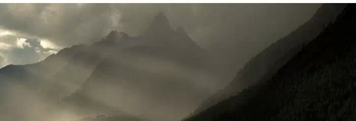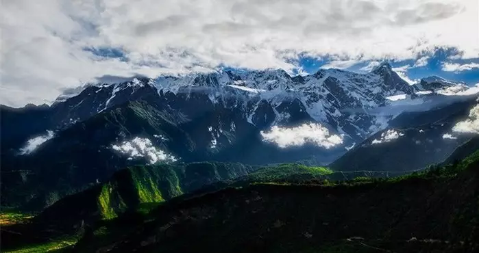 在明与暗、冷与暖的对比中,山峰的雄伟更加衬托了村庄的宁静。