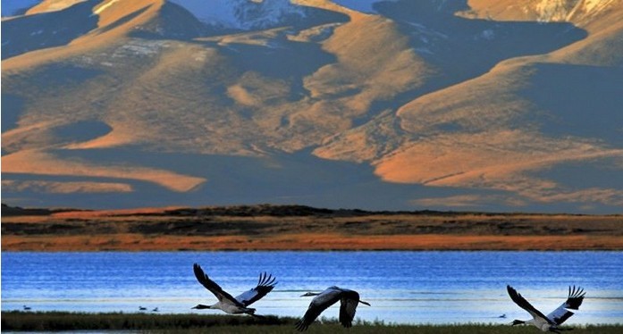 低低飞翔的鹤显示出玛旁雍措优美的自然生态环境,湖水映射天空的蓝色像一块美丽的蓝宝石。