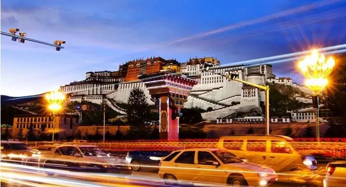 布达拉宫门前川流不息的车辆在慢速快门之下变成了色彩的河流,这样流光溢彩的气氛更加衬托布宫的雄伟。