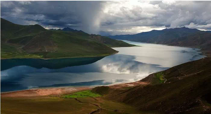 羊卓雍措的蜿蜒走势将观者的目光引向远方,大气磅礴的风起云涌让画面的气势很足。