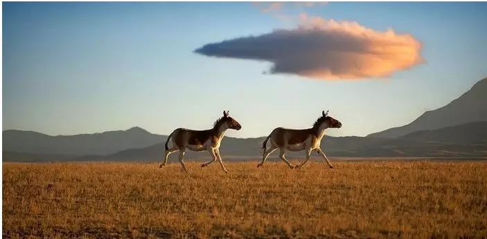 神马浮云,两匹步调一致的马奔跑在辽阔的草原上,与天上的云相呼应形成了一个很有谐趣的画面。