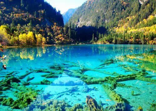 :九寨沟,一个童话中的仙境,这里的一山一水美得令人窒息。山、林、云、天倒映水中,树在水中长,水在林中流,水树交融,水色使山林显得更加青葱,山林使水色显得更为娇艳;瀑泻入湖,湖瀑相生,层层迭迭,相衔相依;从雪山上不断流畅下的泉水,源源不断的注入一个个五彩池,流光溢彩,清澈神秘。百万年来才慢慢形成的钙化池,层层叠叠,见证佳侣们永恒不变的爱情。