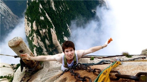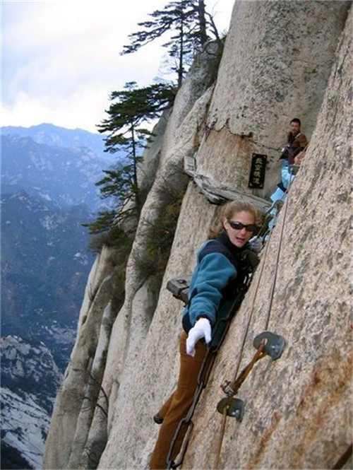 华山的索道可以说是世界上最险峻危险的。脚下就是万丈悬崖的感觉既刺激又惊险。喜欢攀岩徒步似乎是很多老外的一种标志性运动。几个热爱徒步攀岩的老外在华山的栈道上摆pose,挑战这种世界上最危险的徒步索道。