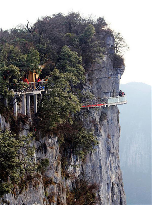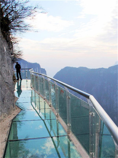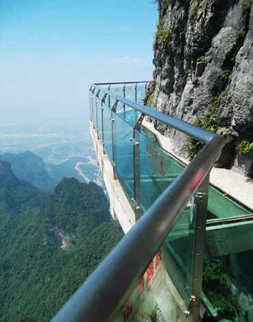 张家界天门山玻璃栈道悬于山顶西线,长60米,最高处海拔1430米。是张家界天门山继悬于峭壁之上的鬼谷栈道、凭空伸出的玻璃眺望台、从玻璃台可以看见下面。玻璃台伸出栈道有4-5米,专供游人拍照、横跨峡谷的木质吊桥后打造的又一试胆力作。