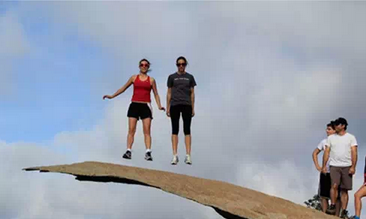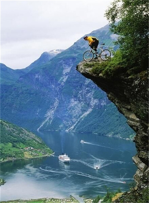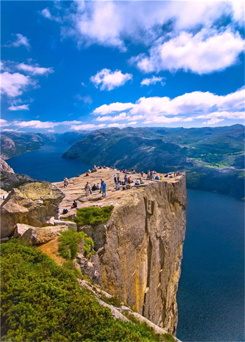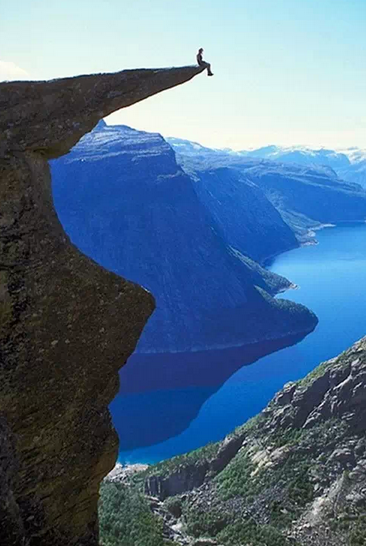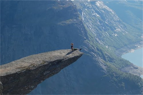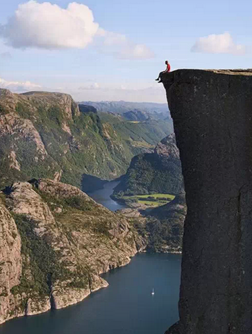挪威的布道石,挪威语叫Preikestolen。是一块天然的被冰川刷出来的四四方方的岩石,高约600米,处在挪威石油之都Stavanger境内附近的丽萨峡湾中。其实这块岩石本身并不危险,不过站在岩石的边上往下看,峡湾上吹起的大风能瞬间让人感到一阵晕眩。听说有人带自己的宠物狗爬山,结果有的游客非常坏,往岩石外扔骨头,结果可怜的狗狗就一跃而起纵身而下。