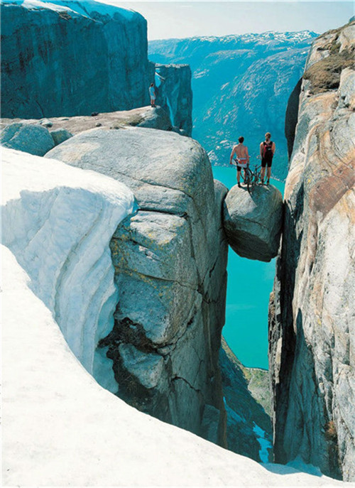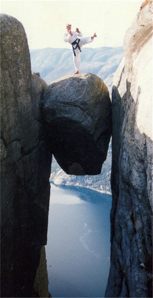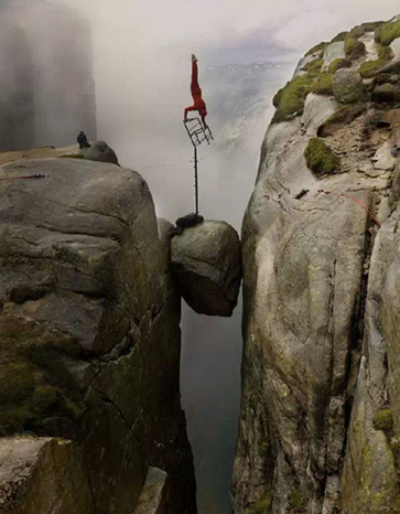 这一个估计见过的朋友就比较少了吧。即使是挪威人去过这个景点的人都不多。挪威名字叫做Kjerag。是一个夹在两座悬崖中的一个宽不到5米的岩石,悬架于海拔近1000米的高空,下面就是丽萨峡湾的尾部,这座景观也处于Stavanger附近。是爬山爱好者的必玩高阶之地。